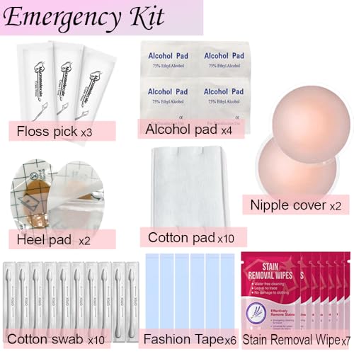 • Wedding Emergency Kit: This compact makeup bag comes with sewing kit, manicure set, folding hairbrush with mirror, hairband, nipple covers, 6 fashion tapes, 3 styling clips, 10 hair pins, 10 hair ties, 4 cleaning pads, 3 floss picks, 2 heel pads,10 cotton swabs, 10 cotton pads,7 stain removal wipes. whole neatly packed for your convenience