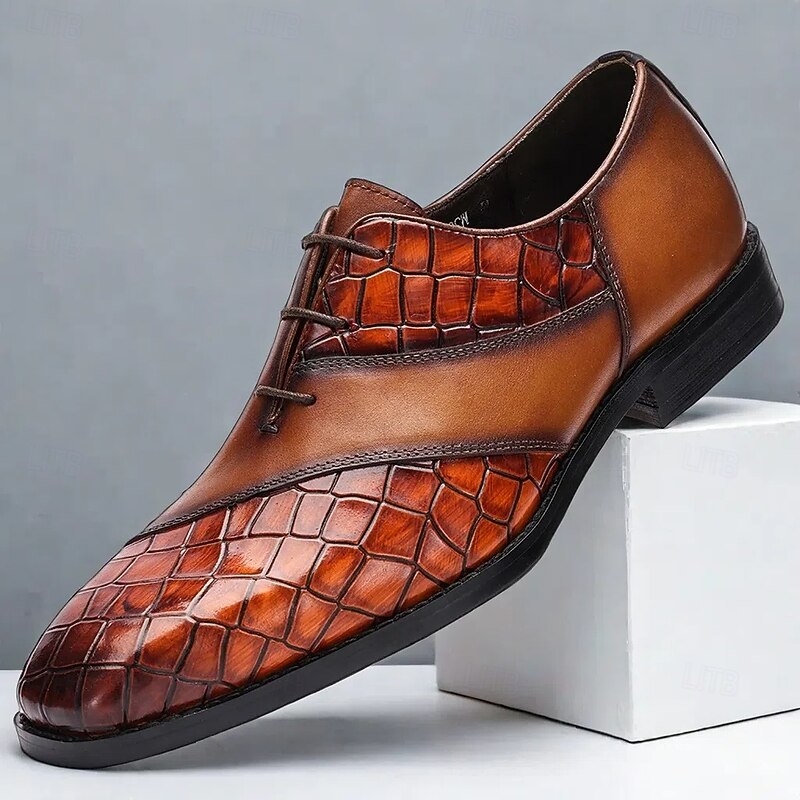 Men's Brown Crocodile Embossed Leather Oxford Shoes – Premium Cowhide Formal Lace-Up Shoes for Business and Special Events