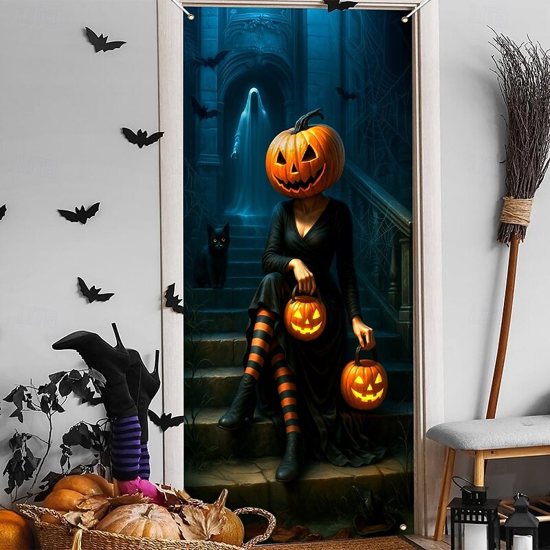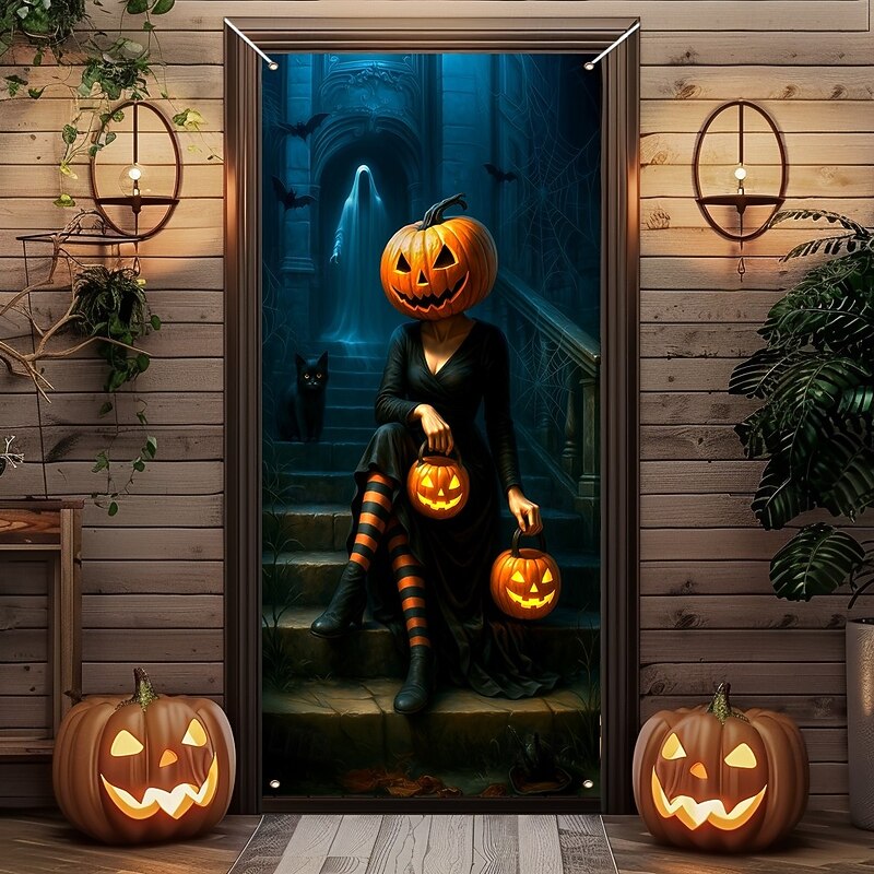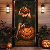 $18.99 - Halloween Door Cover – Pumpkin Head Woman with Jack-o'-Lanterns, Haunted House Entrance Banner, Scary Outdoor & Indoor Decoration for 2025 Halloween Bedroom, Living Room, Bathroom 2025. Shop for cheap Halloween Door Covers online? Buy at lightinthebox.com on sale today!