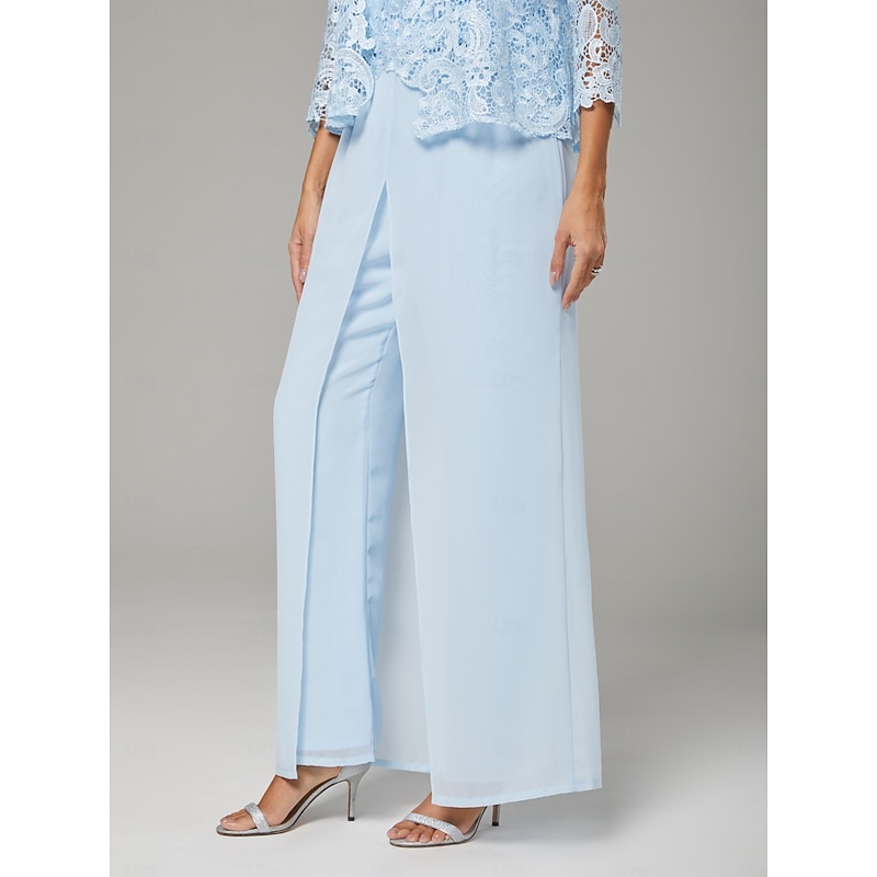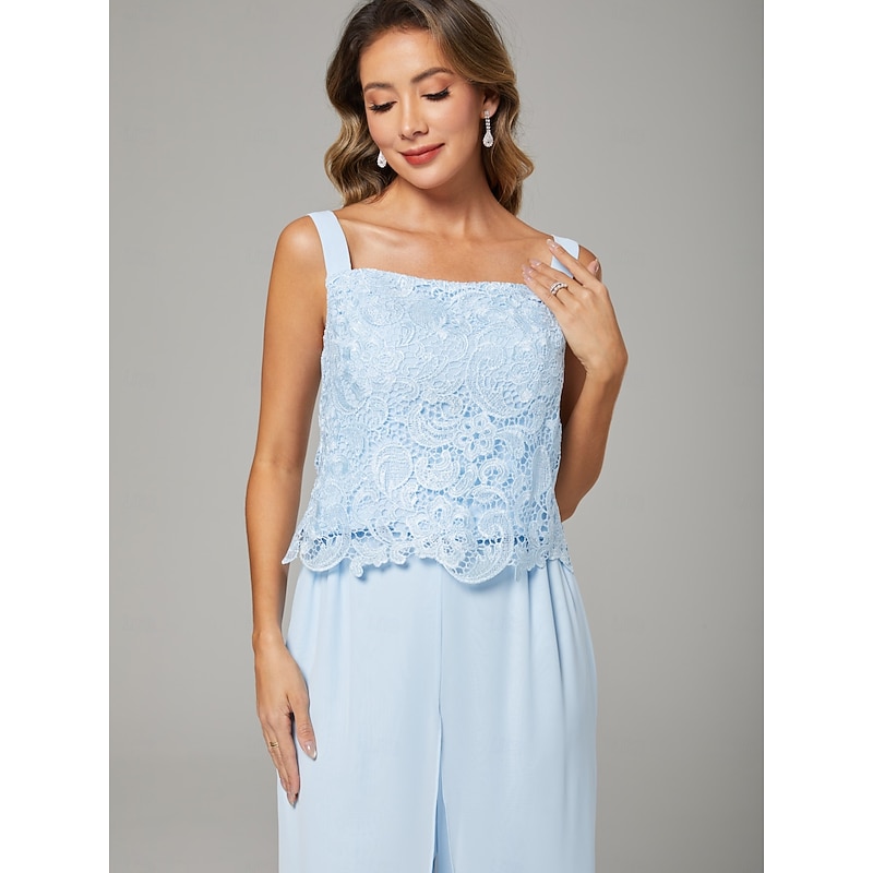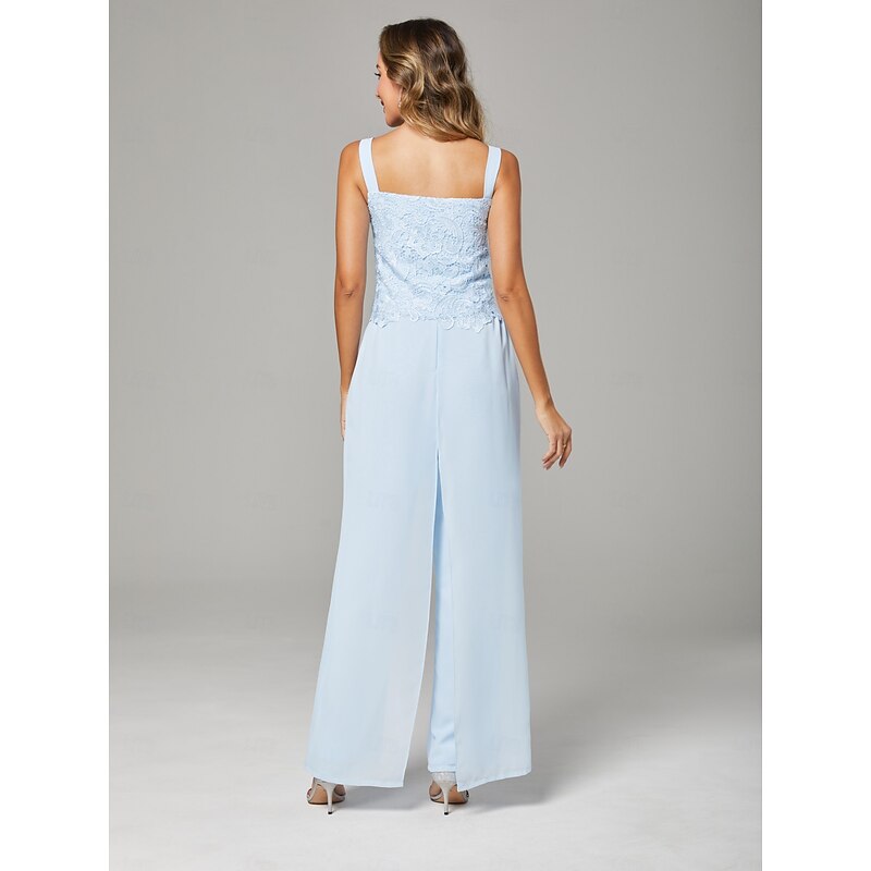 Why Choose Pantsuit 3 Piece Mother of the Bride Dress Formal Wedding Guest Elegant Wrap Included Square Neck Floor Length Chiffon Lace Sleeveless Wrap Included with Appliques?